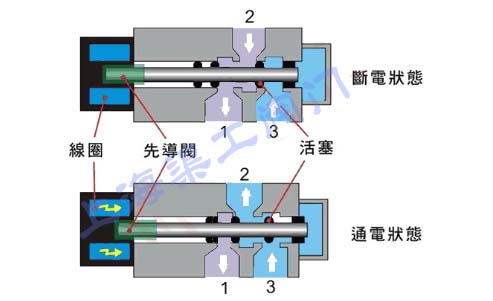 單電控二位三通電磁閥工作原理: 電磁閥激勵(lì)(電磁線(xiàn)圈流過(guò)電流,閥芯在電磁力的作用下移動(dòng),使閥芯壓縮彈簧,并移動(dòng)到右側(cè),3和2口相通,1口封閉) 電磁閥失勵(lì)(電磁閥線(xiàn)圈沒(méi)有電流通過(guò),因此,電磁閥的彈簧釋放,將閥芯移動(dòng)到電磁閥的左側(cè),1和2口相通,3口封閉)  |