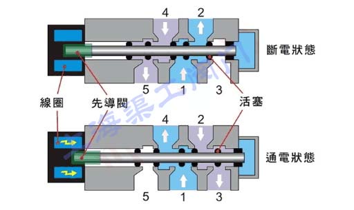 電磁閥失勵(lì)(電磁閥線(xiàn)圈沒(méi)有電流通過(guò),因此,電磁閥的彈簧釋放,將閥芯移動(dòng)到電磁閥的左側(cè),1和2口相通,4和5相通,氣源從1口進(jìn)入氣缸,5口排出氣缸里的氣體)